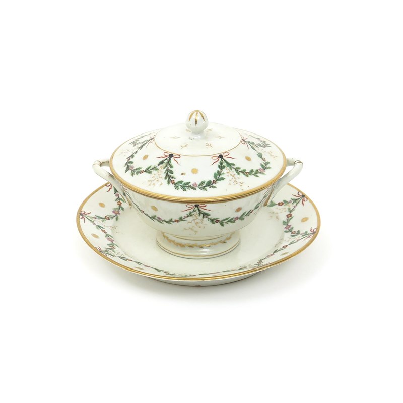 A Paris porcelain tureen with cover and stand late 18th/early 19th century, of circular form, painted with leafy swags suspended from tied red ribbons, with small gilt foliate motifs, one handle restored, 23cm. (3)