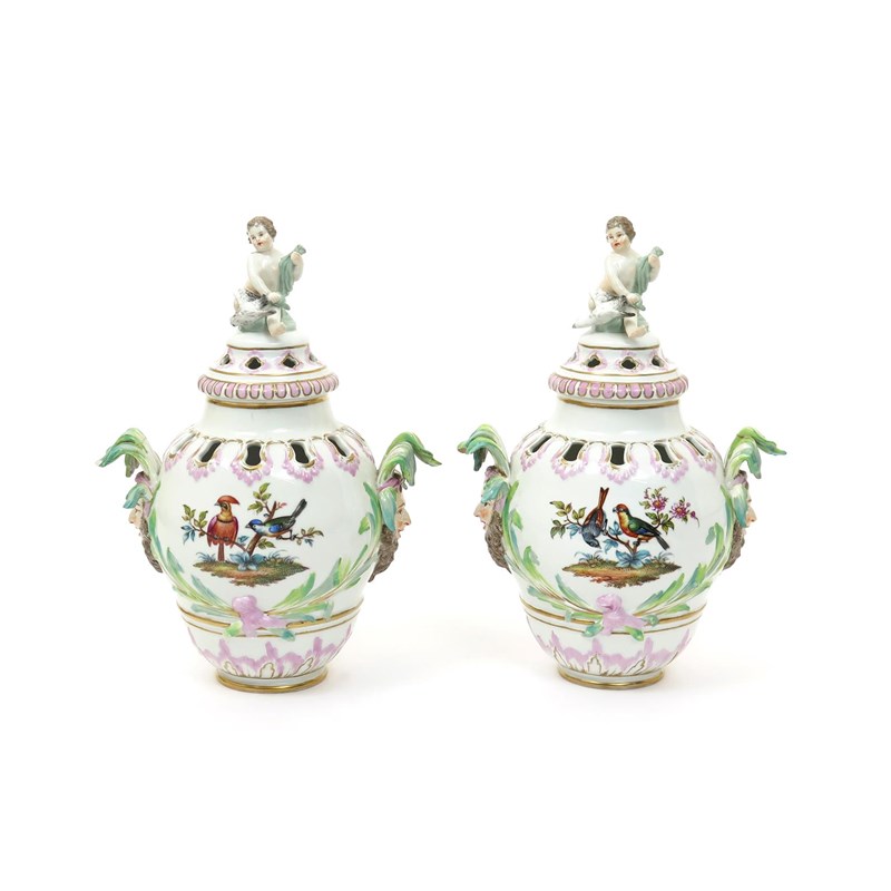 A pair of Berlin pot pourri vases and covers 19th century, the ovoid forms painted with birds perched on low branches between moulded leaf sprays, the shoulders pierced with a band of shaped holes above bearded mask handles, the covers surmounted with a putto holding a bird, blue sceptre marks, some damages and repairs, 34cm. (4)