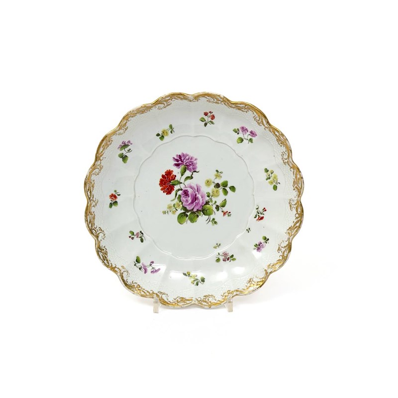 A Vienna dessert plate late 18th century, painted with a spray of colourful European flowers, the scallop-edged rim with osier moulding and a continuous gilt foliate design, blue shield mark, 22cm.