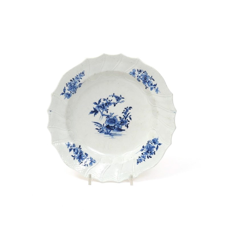 A Tournai blue and white plate c.1780, painted with the Ronda pattern of prunus and peony issuing from low rockwork, the rim with four sprays of Oriental flowers, blue crossed swords and + mark, 24cm.