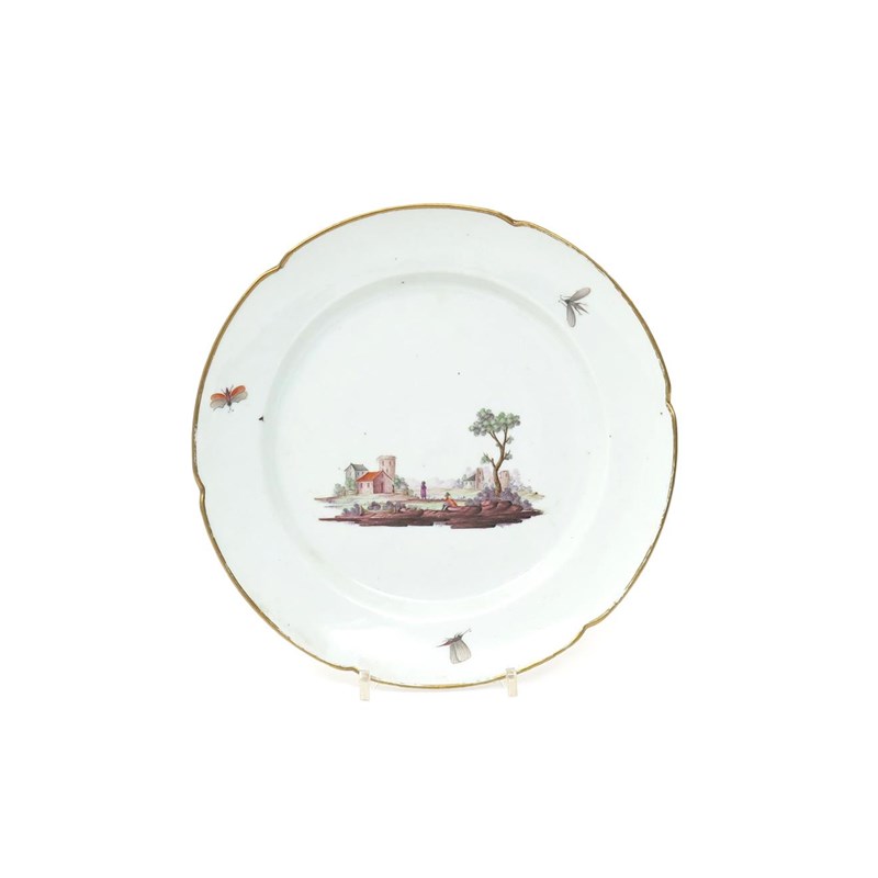 A Niderviller plate late 18th century, painted with two figures in a rural landscape with rustic buildings, with three scattered flying insects, gilt line rim, blue N. mark, 24.3cm.