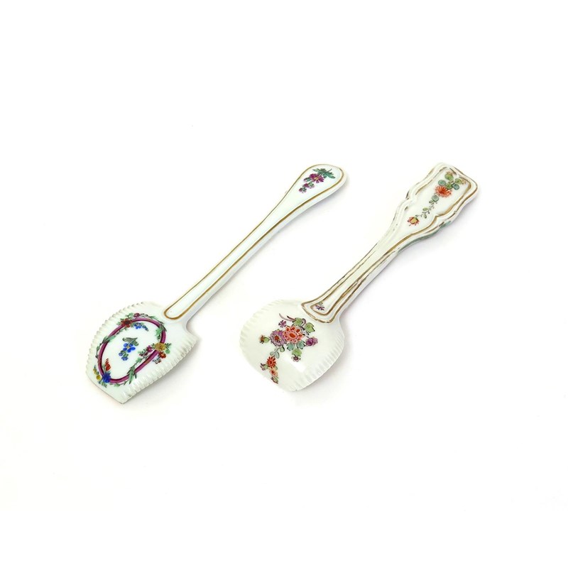 Two Meissen butter curlers or spoons mid 18th century, the curved bowls with a serrated surface, one painted to the reverse with small sprigs of deutscheBlumen within a puce border garlanded with leaves and further flowers, the other with sprays of indianischeBlumen, the scrolled edge highlighted in gilt, the latter restored through the stem 15.3cm max. (2)
