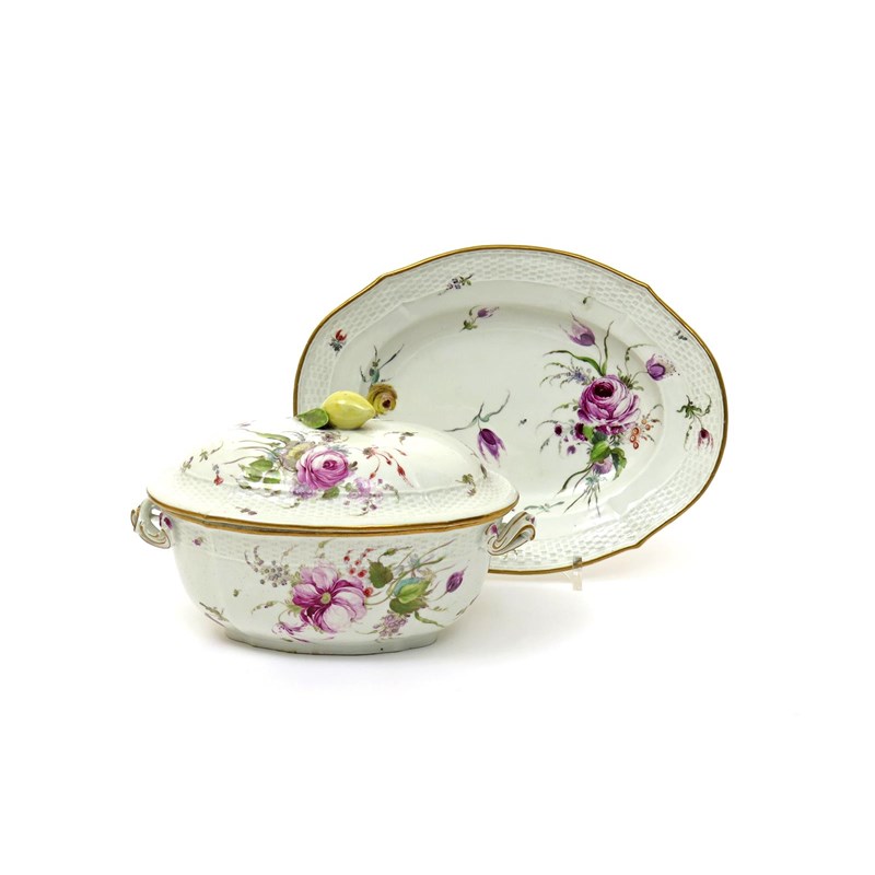 A Frankenthal oval tureen with cover and stand c.1765, with osier moulded borders, finely painted with large sprays of European flowers, the cover surmounted with a lemon finial, blue crowned CT mark, 24.7cm. (3)