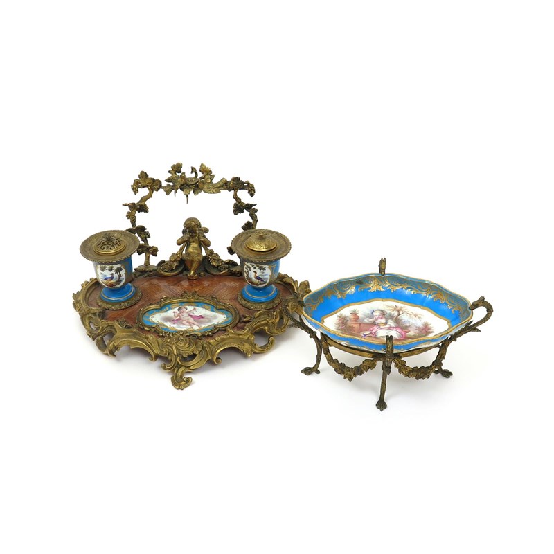 A Sèvres ormolu-mounted dish date code for 1766, painted with a young girl leaning against a low wall between rose bushes, within a bleu celeste border, interlaced LL mark and painter's mark for Bulidon, and an ormolu-mounted inkstand set with a quatrefoil plaque painted with a putto, and two inkwells painted with birds, 32cm max. (2)