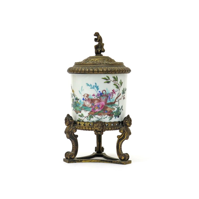 A French porcelain ormolu-mounted toilet pot and cover 18th century, painted in the Sèvres manner with a sheep wearing a blue ribbon, recumbent beside a basket and a pink hat, the reverse with birds in flight, sitting into an ormolu base with term feet, the cover surmounted with a monkey finial, disguised interlaced LL mark, 16.5cm. (3)