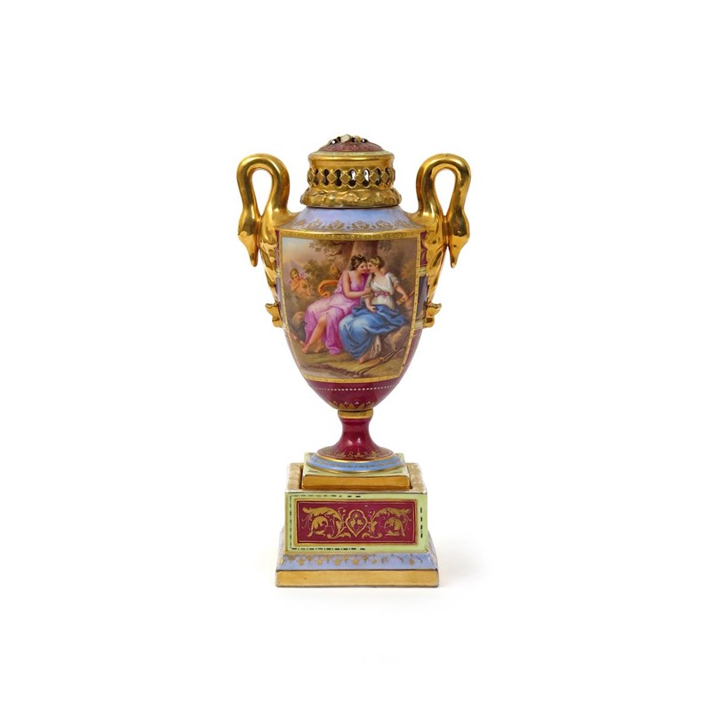 A Vienna-style vase with cover and stand 19th century, painted with Cupid spying on two maidens with quivers of arrows, reserved on a rich ground of coloured panels with formal gilt designs, the shoulders with swan head handles, raised on a square base, blue pseudo shield mark, the cover broken and repaired, 30.5cm. (3)