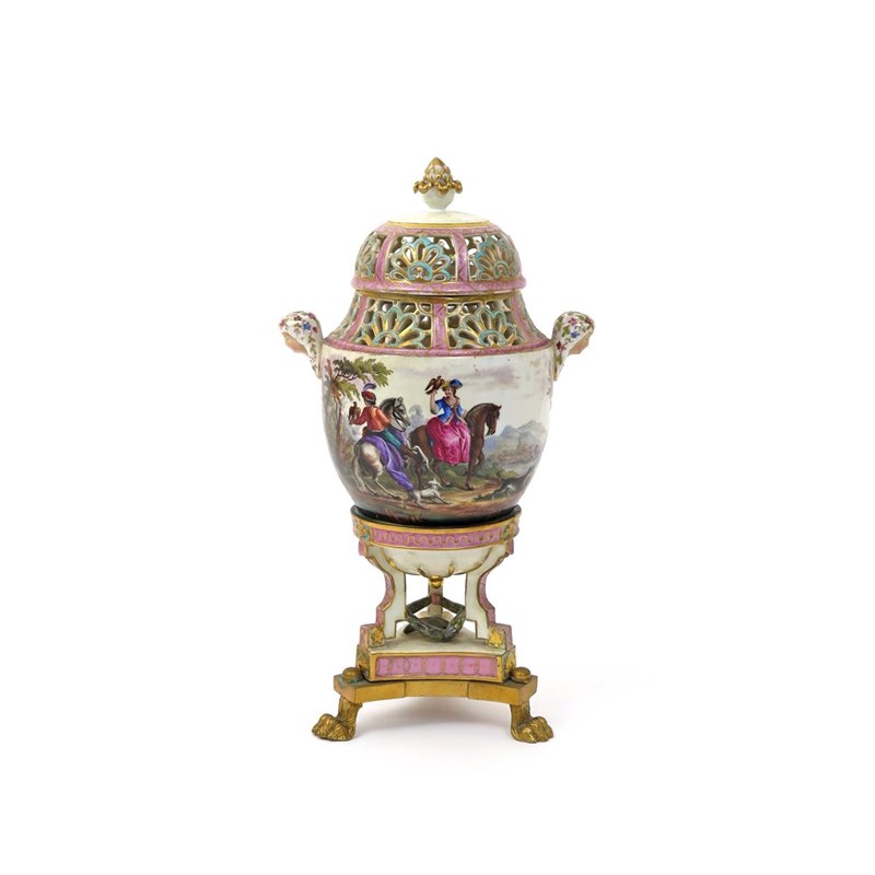A Continental porcelain pot pourri vase and cover 19th century, painted with a continuous scene of a stag hunt, with two figures on horseback holding falcons while dogs run on ahead, the shoulder and cover pierced with a flowerhead design picked out in pink, turquoise and gilt, raised on an ormolu tripod base, some restoration, 35.5cm. (2)