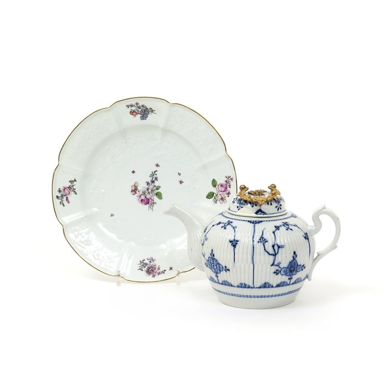 A Wegely teapot and associated cover c.1755-57, painted in underglaze blue with a version of the Strawflower pattern, blue W mark, the cover fitted with a gilt metal finial and overhead handle, and a Meissen plate, moulded in the Gotzkowsky manner and painted with floral specimens, 24.2cm max. (3)