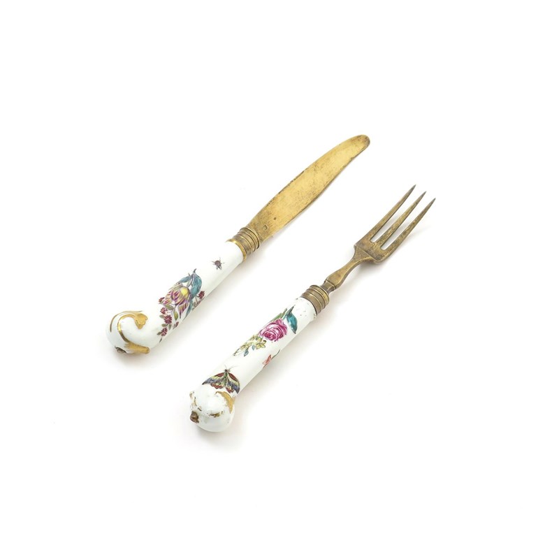 A pair of Continental porcelain cutlery handles late 18th century, possibly Vienna, of pistol grip shape, finely painted in polychrome enamels with sprays of flowers including rose, narciussus and tulip, among scattered moths and other insects, with a gilt-coloured metal knife blade and three-pronged fork with 19th century French marks, 21cm max. (2)