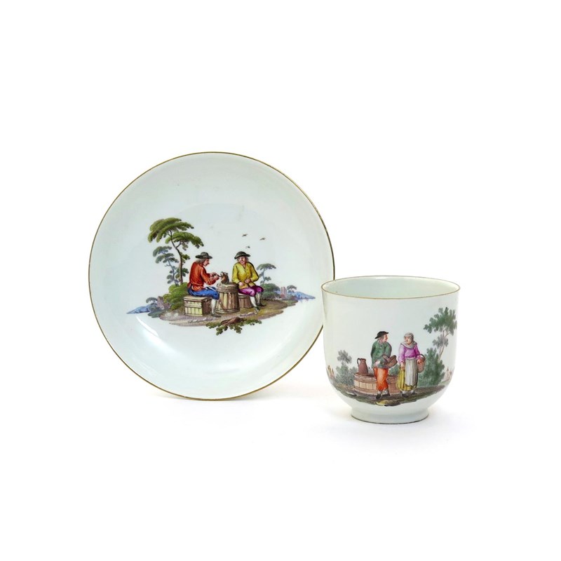 A Meissen cup and saucer c.1760, the saucer painted with two European figures seated either side of an upturned barrel, the cup with a couple holding wicker baskets, a church visible in the distance beneath tall trees, blue crossed swords mark, 13.5cm. (2)