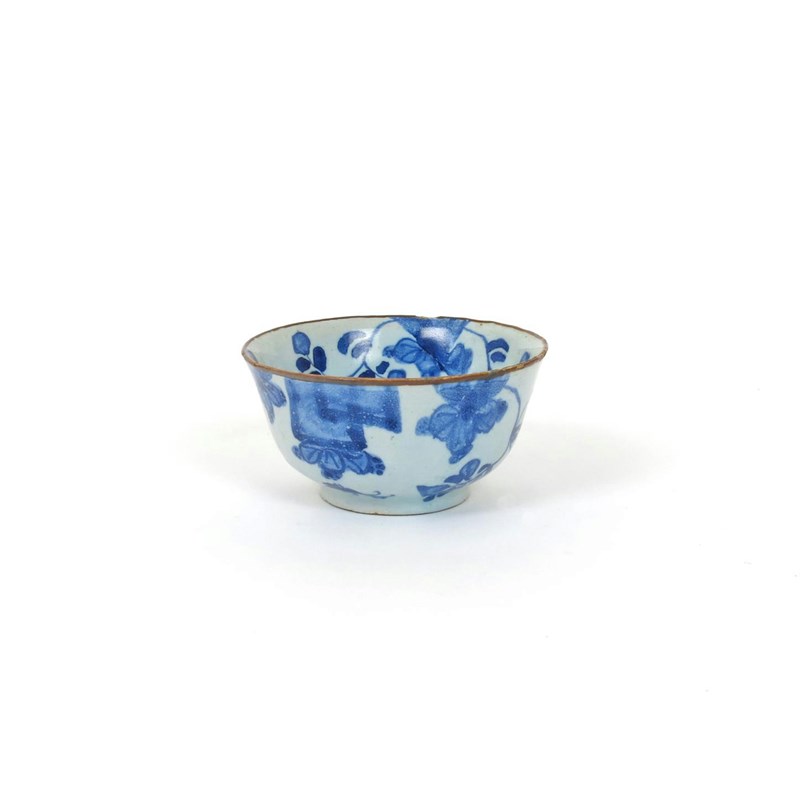 A delftware teabowl 18th century, painted in blue with flying insects around flowering peony sprays issuing from the rim, brown line rim, 7.2cm.