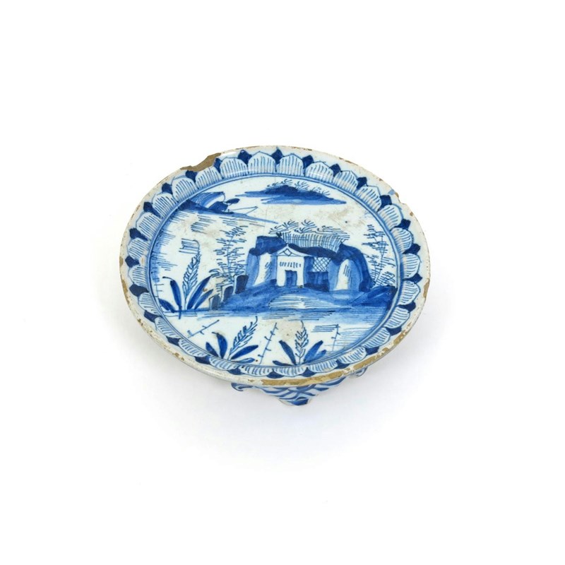 A London delftware teapot stand c.1720, painted in blue with a small figure fishing from rocks in a river landscape, with small buildings on a rocky island, within a stiff leaf border, raised on three shaped feet, a little rim chipping, 13cm.