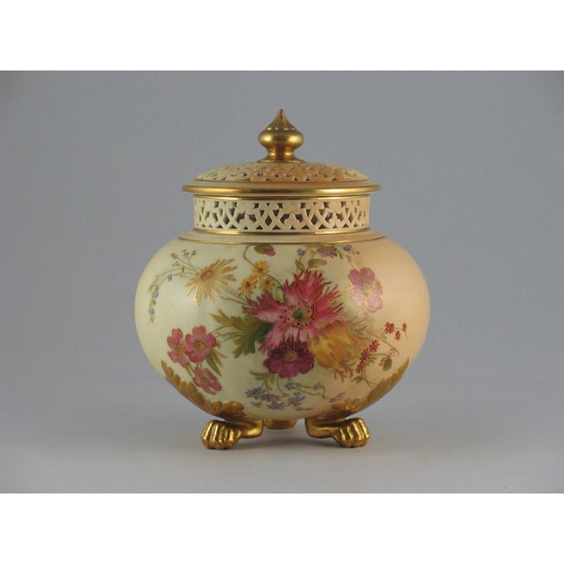A Royal Worcester pot pourri vase, cover and inner lid , decorated with flowers and raised on three feet, c.1908, 18cm. (3)