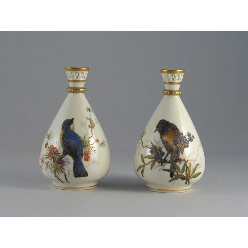 A pair of Royal Worcester vases, decorated with birds, c.1888, 15cm. (2)