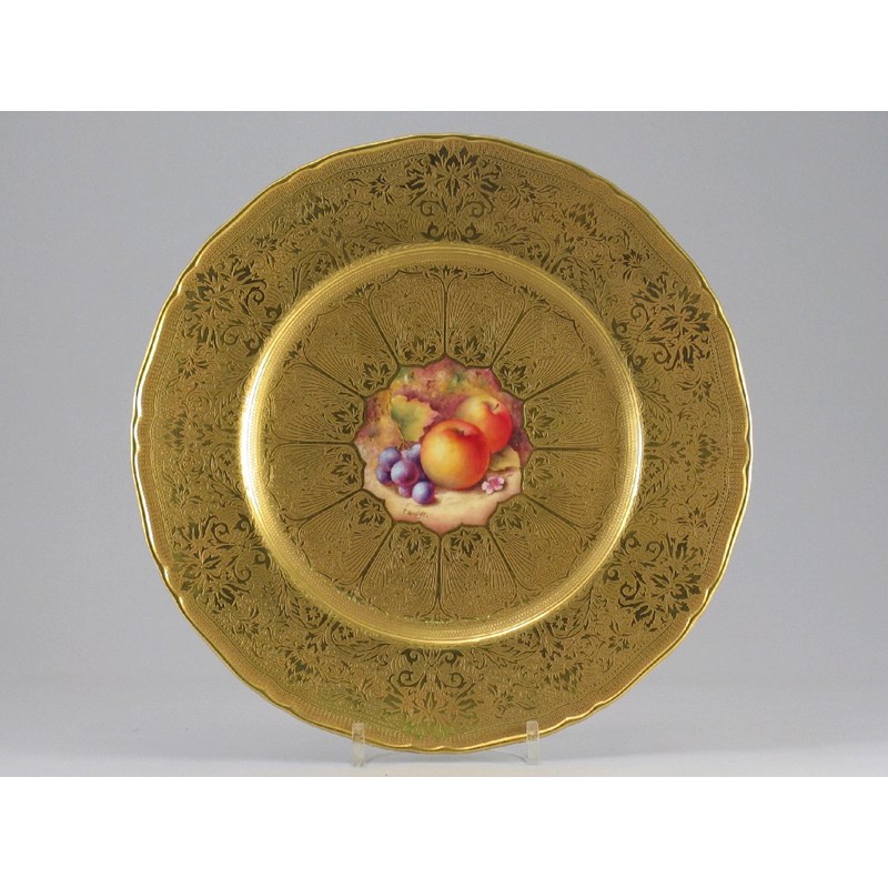 A Royal Worcester gold-ground plate, the centre painted with fruit, signed 'C. Hughes', gold mark, 20th century, 27.5cm.