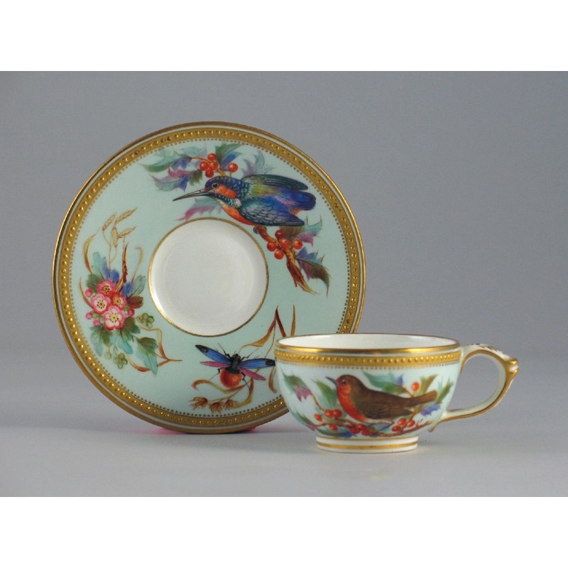 A small Royal Worcester cup and saucer, painted with a robin, a kingfisher and two large insects, impressed mark, c.1880. (2)