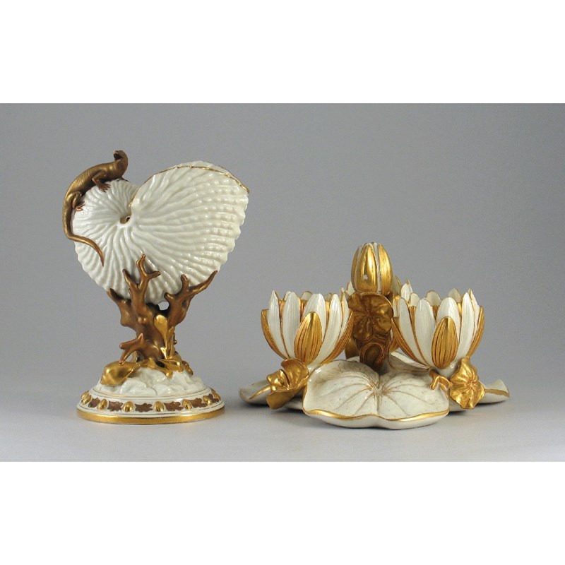 A Royal Worcester nautilus shell vase, applied with a lizard, and a Royal Worcester vase formed as three water lilies. Some damage. Both late 19th century, 25cm. Max. (2)