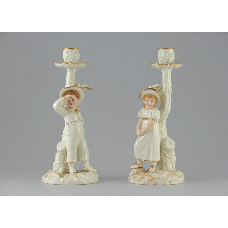 A pair of Royal Worcester candlestick figures, of a boy and girl, heightened in enamels and gilt, c.1887, 26cm. (2)