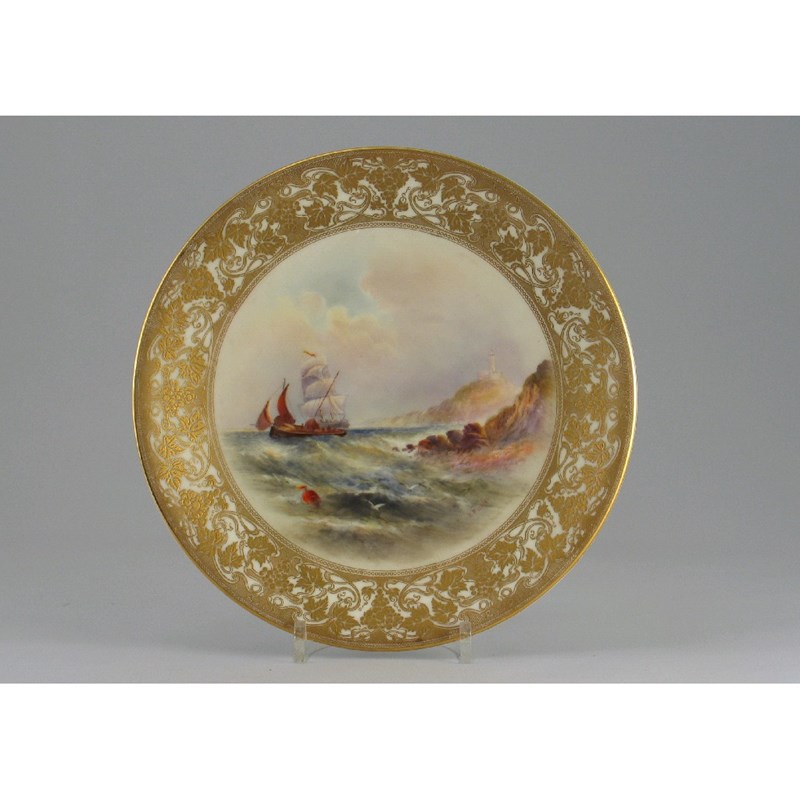 A Royal Worcester plate, painted with ships by the coast, signed 'Rushton', within a gilt vine border, titled 'Off The Mumbles', c.1914, 23.5cm.