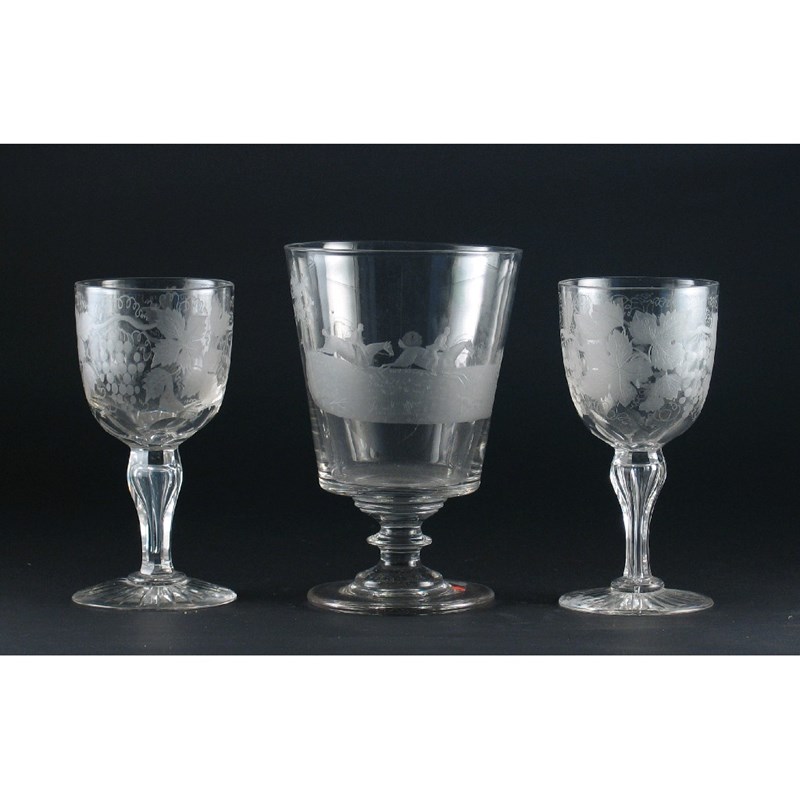 Hunting Interest: a large glass goblet, engraved with huntsmen and hounds chasing the fox, the reverse monogrammed 'EL', together with two Victorian engraved wine goblets, 21cm. Max. (3)