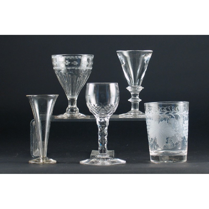 A wine glass, with a faceted stem and four other glasses. 18th and 19th century, 14cm. Max. (5)