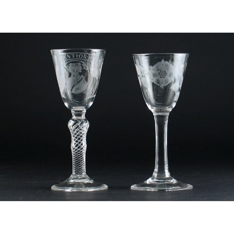 Two Jacobite style glasses, one inscribed 'Audentior Ibo' , the other engraved with roses, 20th century, 19.5cm. Max. (2)
