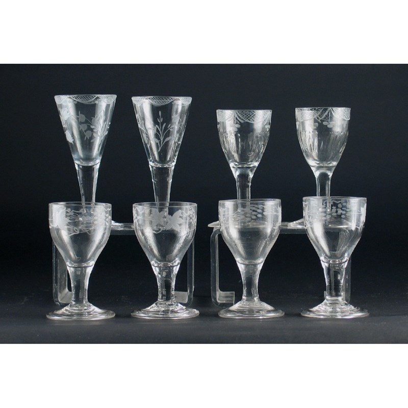 Eight various engraved glasses. The two moulded glasses with foot-rim chips. 12.5cm. Max. (8)