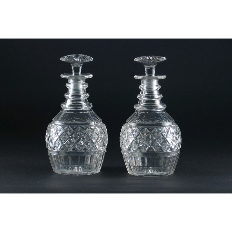 A pair of decanters and stoppers, with triple ring necks and hobnail cut bodies, 21cm. (4)