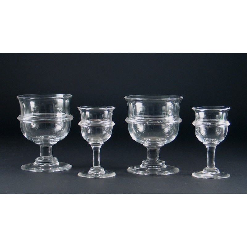 A set of six wine glasses, with single bands to the rounded bowls and six matching smaller glasses. (12)