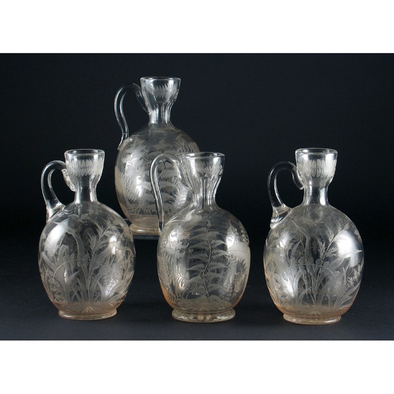 A set of four glass bottles, each engraved with insects above flowering grasses, 19th century, 17.5cm. (4)