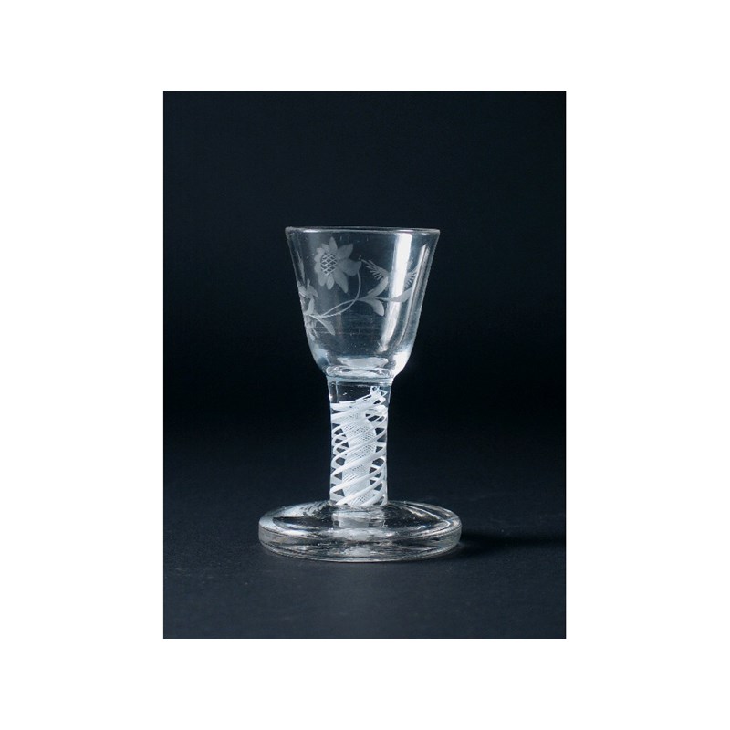 A small wine or toasting glass, the bowl engraved with a flower and a bird, on an opaque twist stem with a heavy circular foot, c.1770, 11cm.