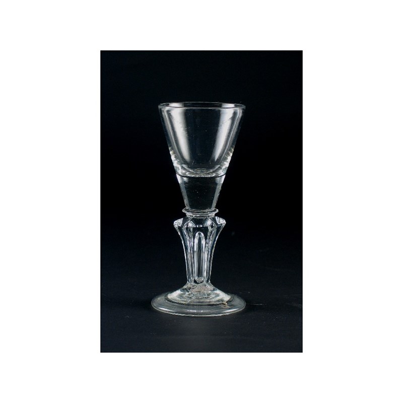 A wine glass, with a conical bowl on a hexagonal moulded hollow stem and folded foot, 1st half 18th century, 14.9cm.