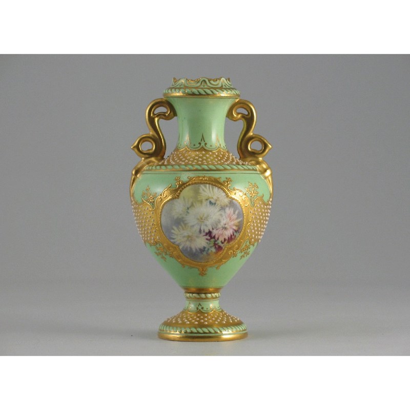 A jewelled Coalport vase, painted with two panels, one of chrysanthemum on a green and gold ground, c.1900, 15cm.