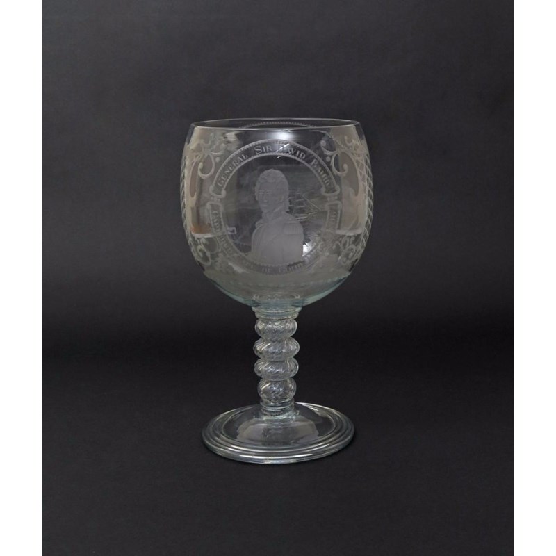 A massive commemorative glass goblet 19th century, the rounded bowl engraved with a titled portrait of General Sir David Baird, underneath inscribed 'Captured Cape of Good Hope 1806', the reverse with a three-masted ship at sea, raised on a moulded multiple knop stem, 35cm.