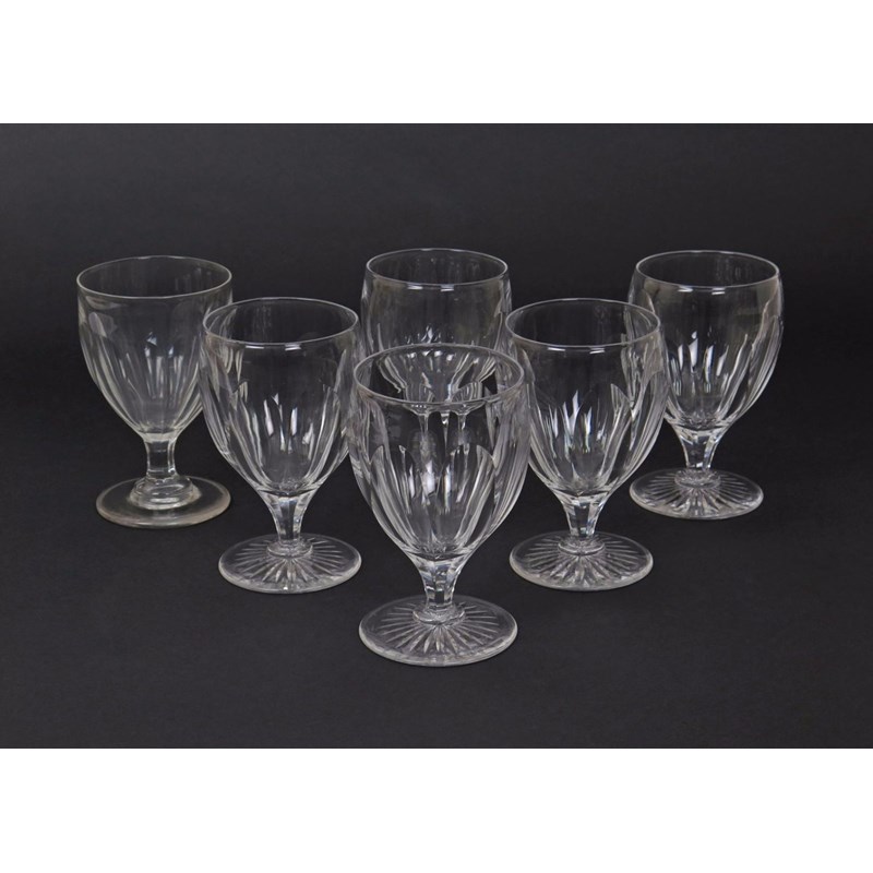 Six glass rummers, the generous bowls cut with lappets and raised on low faceted stems, five on starcut feet, 15cm. (6)