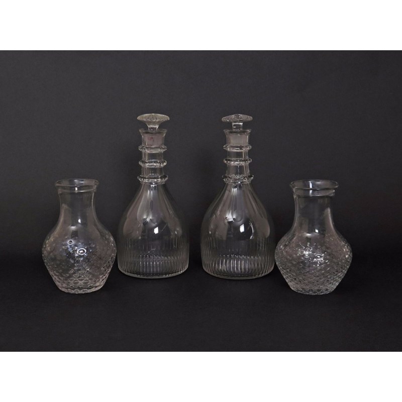 A pair of Prussian decanters and stoppers late 18th century, cut with bands of polished lappets, the necks with three faceted rings, the mushroom stoppers associated, and a pair of glass carafes, of ovoid form with pineapple or dimpled moulding, 25.5cm max. (6)