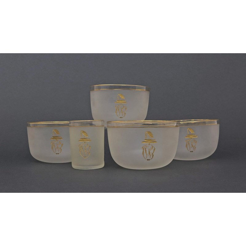 Four armorial glass fingerbowls late 19th/early 20th century, and a small beaker, all engraved and richly gilded with the crest of an egret standing atop a dead fish, above the monogrammed initials CW, 12cm max. (5)