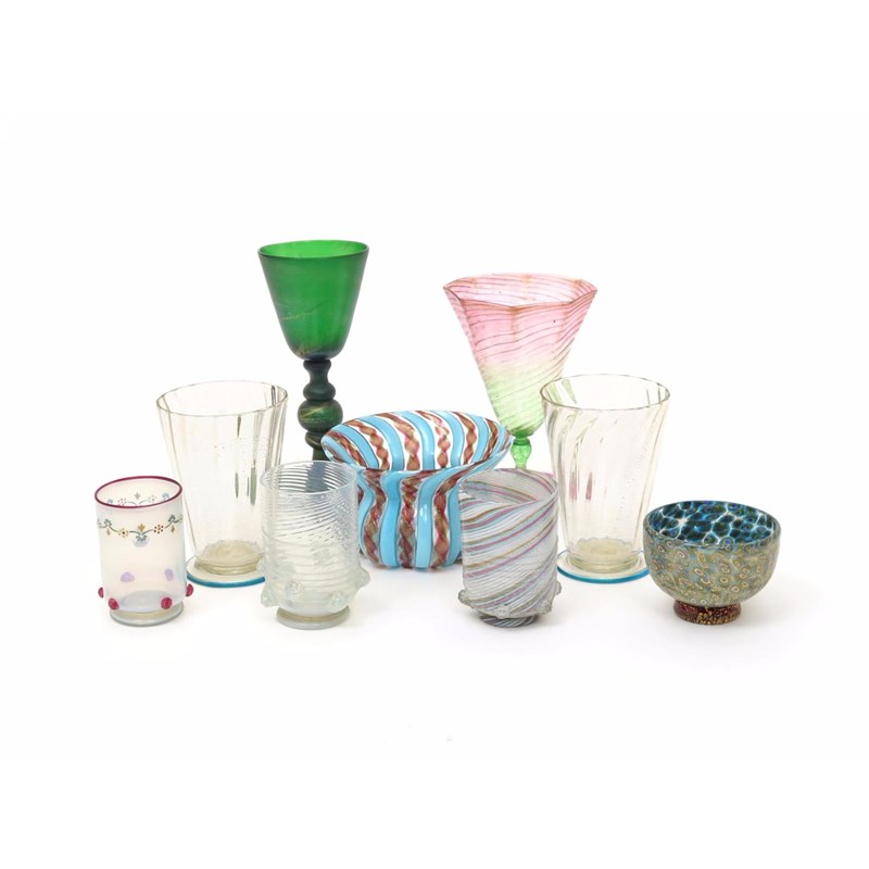 A small collection of Venetian glass 19th and 20th centuries, including a Salviati lobed bowl with everted rim, striped in pale blue and gilt and red aventurine, a small millefiori bowl in shades of blue and gilt, a pair of moulded beakers with blue line footrims, three small rounded beakers applied with raspberry prunts, a spiral-moulded octagonal goblet in pink and green, and a green glass raised on a multiple knopped stem, 18cm max. (9)