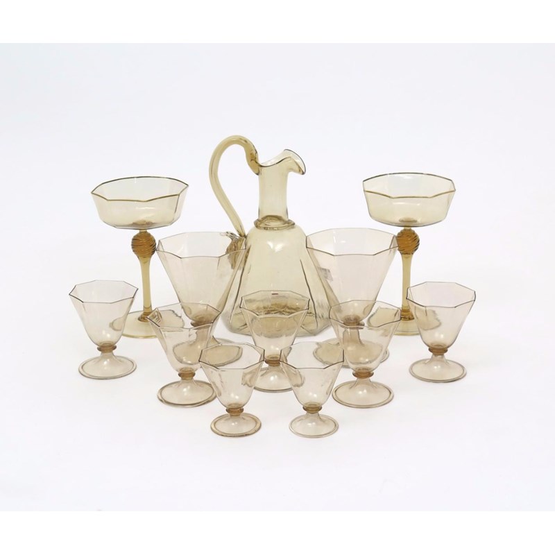 A suite of Salviati glass 20th century, the octagonal forms of a smoky amber colour. Comprising: a jug, five rummers, six wine glasses, five liqueur glasses and two associated cocktail glasses. (19)