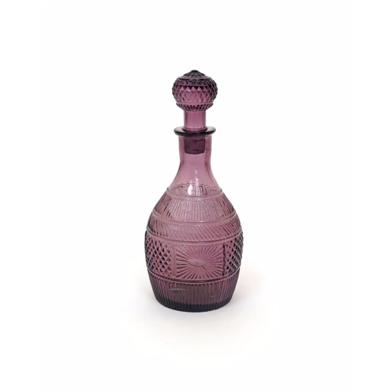 An amethyst glass decanter and stopper c.1820, perhaps American, moulded with starburst designs and diamond banding, 27cm. (2)