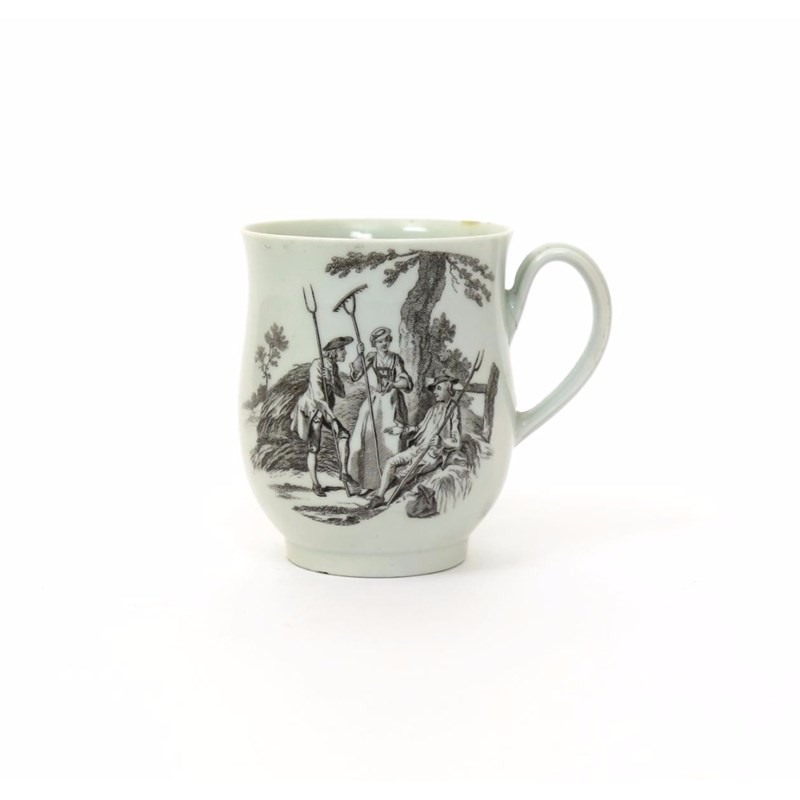 A small Worcester bell-shaped mug c.1760, printed in black with a rare print of The Harvesters by Robert Hancock, three figures holding rakes and pitchforks and chatting after a hard day's work, the reverse with The Minuet after a design by Francis Hayman, some faults, 8.3cm.
