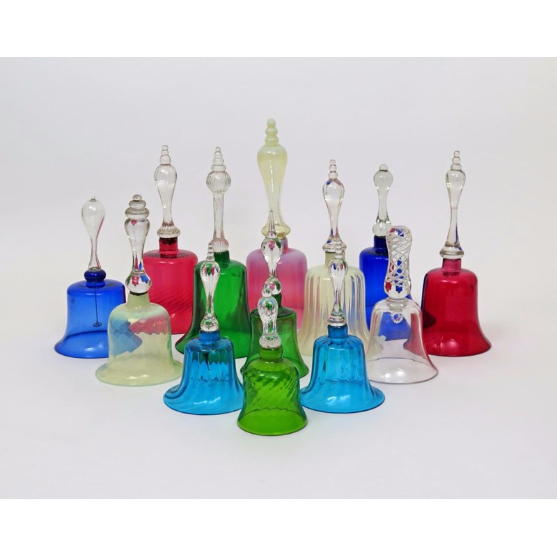 A collection of thirteen Nailsea glass bells 19th century, in red, green, blue and turquoise, of varying size with clear glass knopped handles, 34.5cm max. (13)