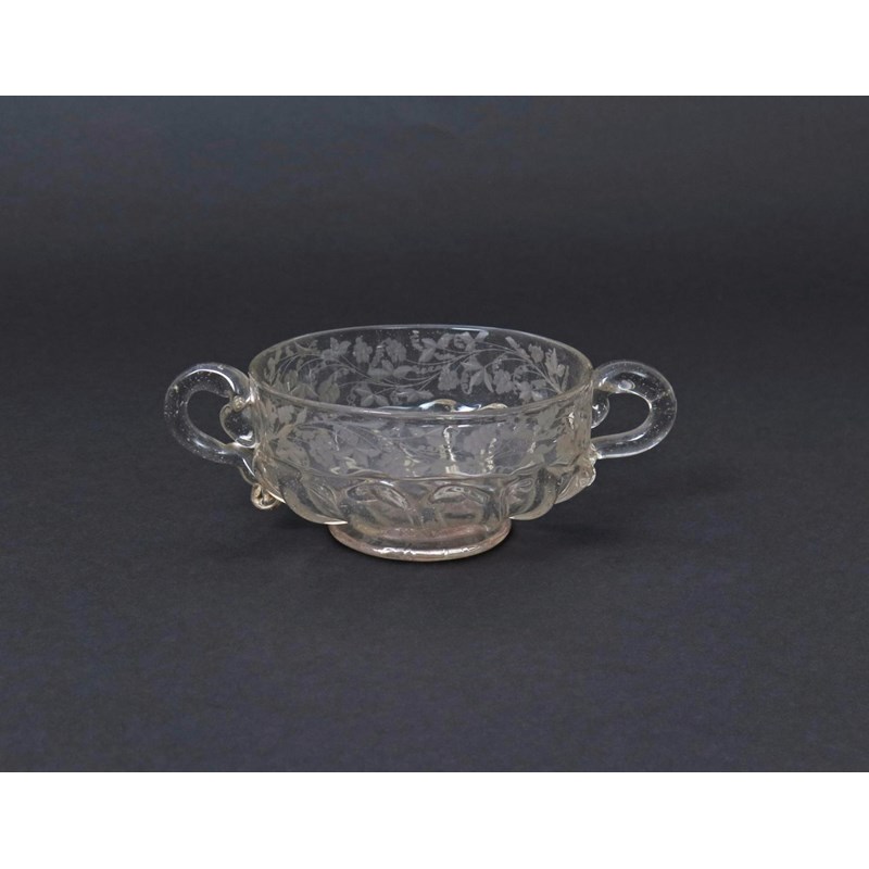 A glass two-handled porringer early 18th century, the shallow bowl with moulded gadrooning beneath an engraved band of grapevine, 18cm.