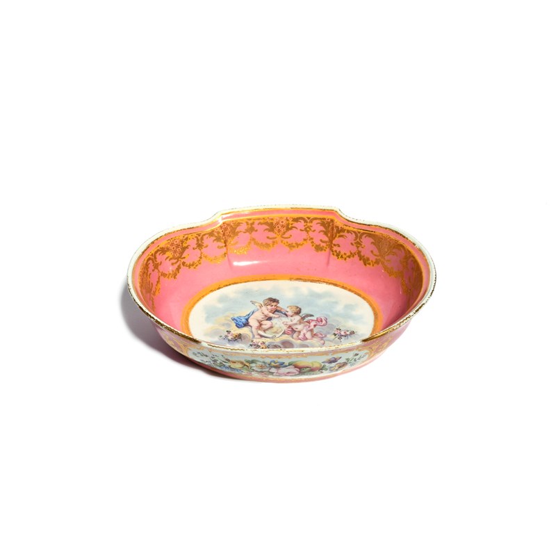 A Sèvres-style bowl or basin late 18th/early 19th century, painted possibly in London, the interior well with a panel of two winged putti seated on clouds with a scroll, the exterior with panels of flowers and fruit, reserved within gilt panelled and foliate borders on a pink ground, blue interlaced Ls mark enclosing the letter Q, wear to the gilding, 29cm across.