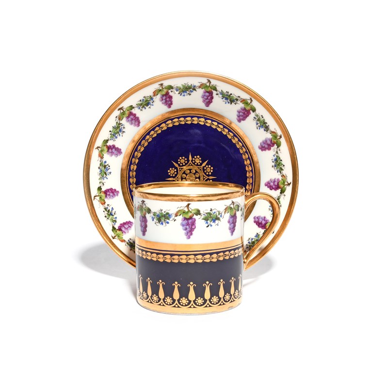 A Sèvres coffee can and saucer dated 1817, painted with a border of bunches of grapes suspended between swags of blue flowers, enclosing a deep blue band with formal gilt borders, printed marks, inscribed '15 Jt 17' to the footrims, 13.3cm. (2)