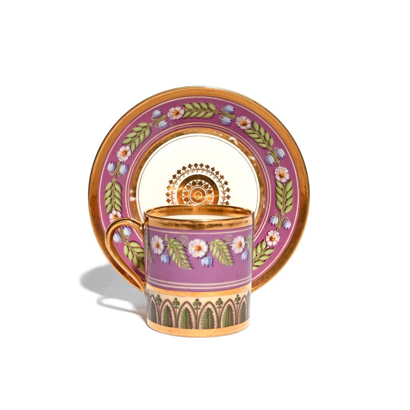 A Sèvres coffee can and saucer c.1814-18, painted with a formal band of bluebells and daisies with leaf husks reserved on a puce band, printed marks, 13.3cm. (2)