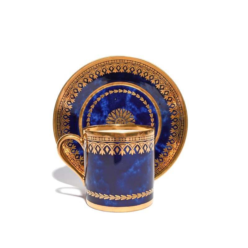A Sèvres coffee can and saucer dated 1818, decorated with formal gilt borders and a narrow husk band reserved on a mottled or washed blue ground, printed mark, the saucer inscribed '23 Mai 18' inside the saucer's footrim, 13.3cm. (2)