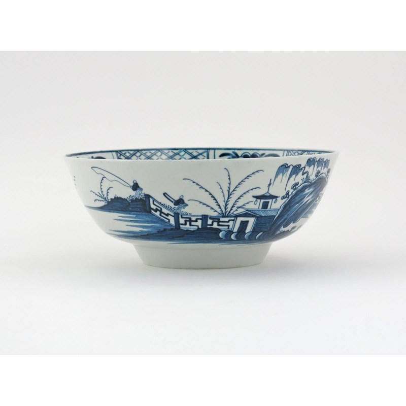 A good Christian's Liverpool blue and white bowl c.1765, well painted with two fishermen at the end of a fence, a third figure the other side of a rock promontory from which spouts willow, 20cm dia.