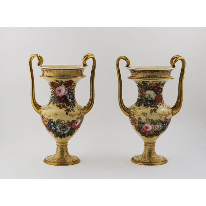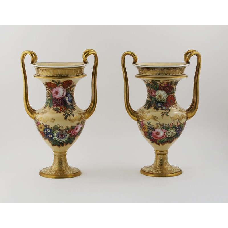 A fine and large pair of Copeland and Garrett Felspar porcelain vases c.1840, finely painted with effusions of flowers and fruit within gilt scrolling borders reserved on a rich cream ground, the tall gilt handles joining the low shoulders to the flared necks, printed marks, 44.5cm. (2)