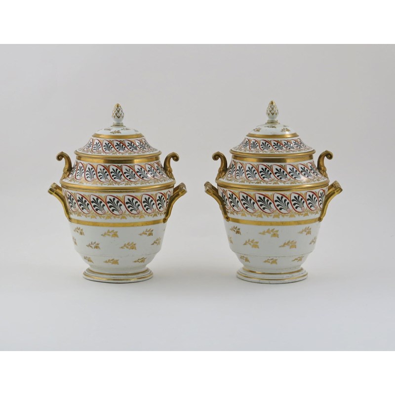 A pair of English porcelain ice pails and covers early 19th century, probably Coalport, decorated with bands of scrolling, stylized leaves in red, black and gilt, the tall domed covers surmounted with pinecone finials, 31.5cm. (4)